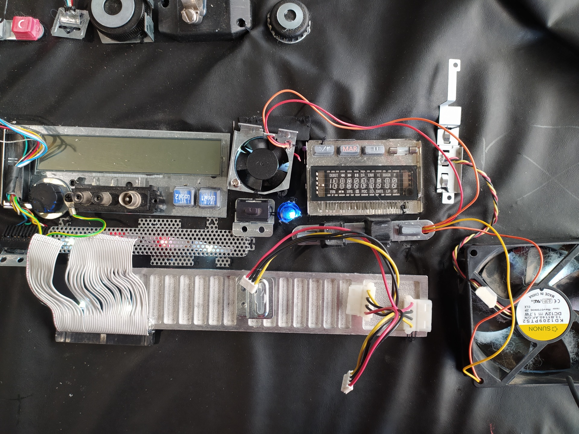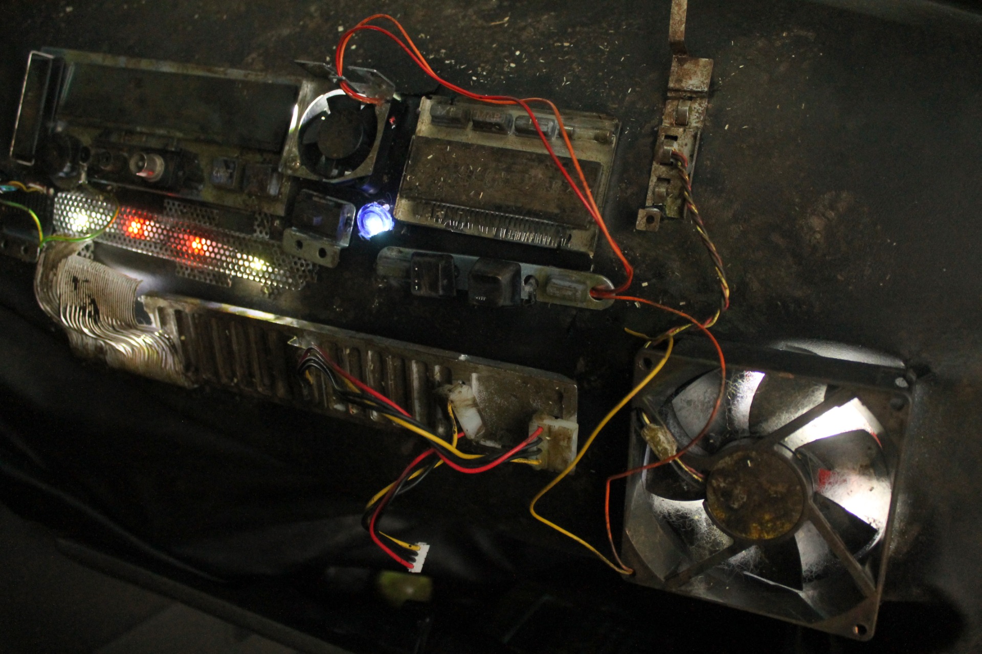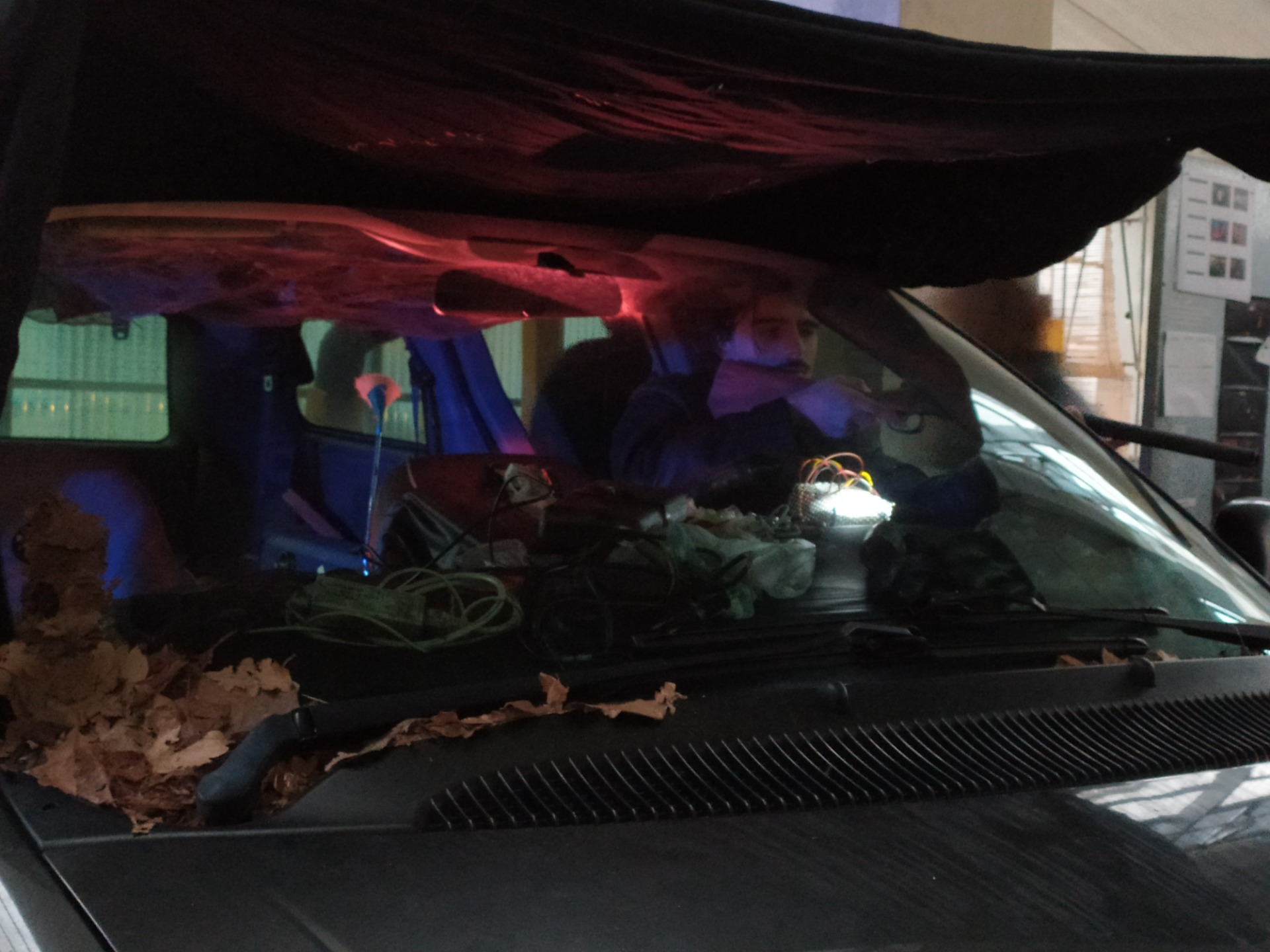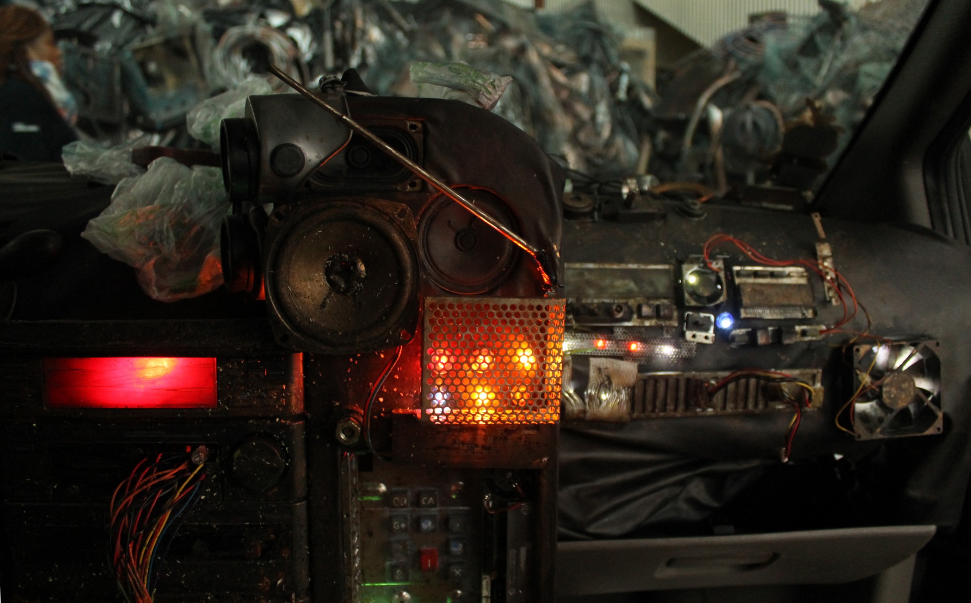 Recherche, fabrication et patines des accessoires. Concept et fabrication d'un faux tableau de bord lumineux et de l'habillage intérieur d'une voiture.